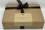 De natuurbruine geschenkdoos met chique bruin lint straalt rust en kwaliteit uit. Binnenin een selectie ambachtelijke chocolade, met zorg gemaakt in onze Vughtse Patisserie. Verfijnd, verrassend en puur genieten.